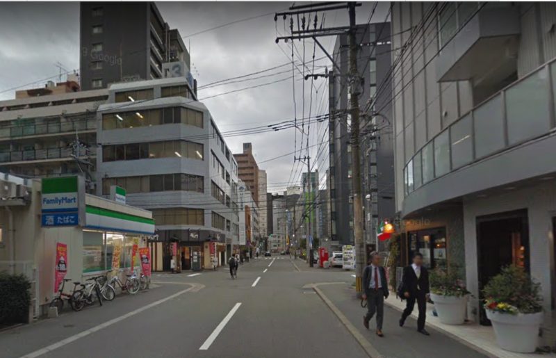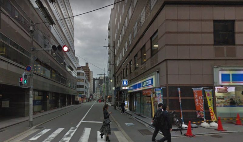 スタート地点はKITTEと郵便局の間にある横断歩道です。正面右のレンガの建物が西日本シティ銀行です。