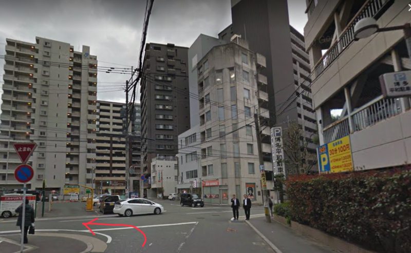 博多平和駐輪場の交差点に出ます。ここを矢印の方向、左に曲がります。