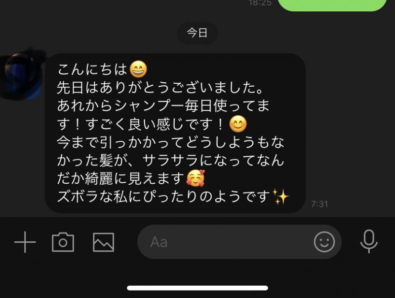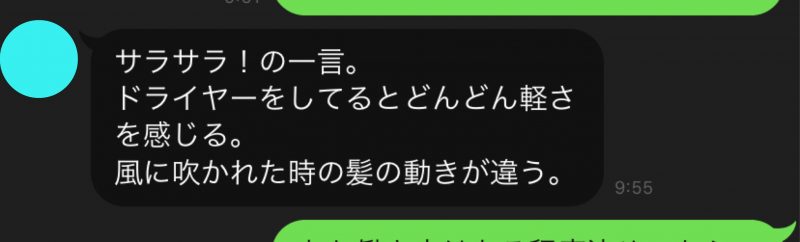 シャンプーで洗ってる時点で絡まりがほどけていきます。トリートメントをつけるともうサラッサラです!嫌なツヤ、手触りもなく自然に指通りのいいヘアスタイルに仕上がります。